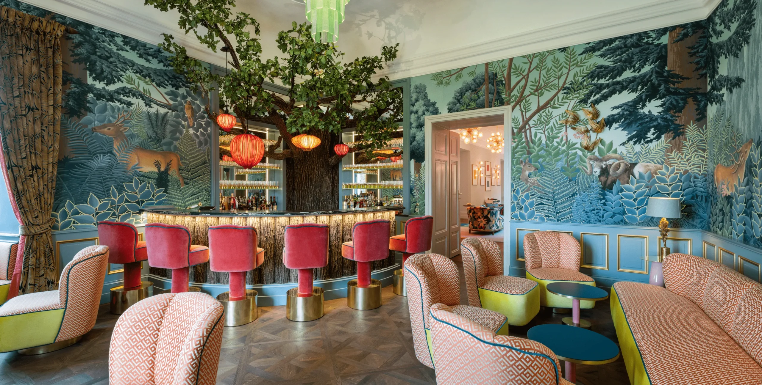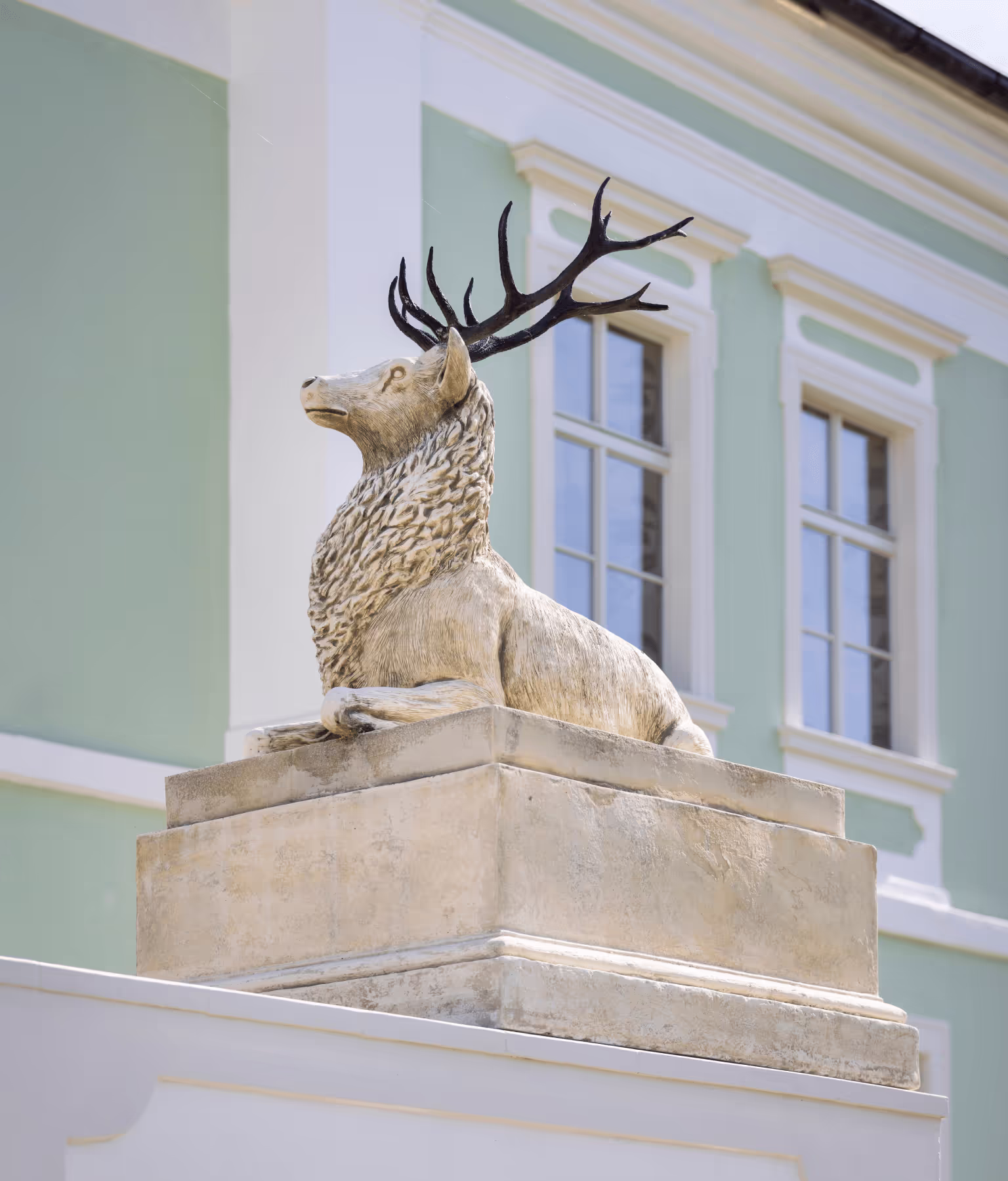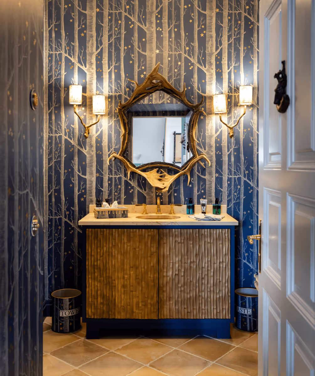Der individuell entworfene Waschtisch und der speziell gefertigte Spiegel tragen das Jagdthema gekonnt ins Badezimmer.