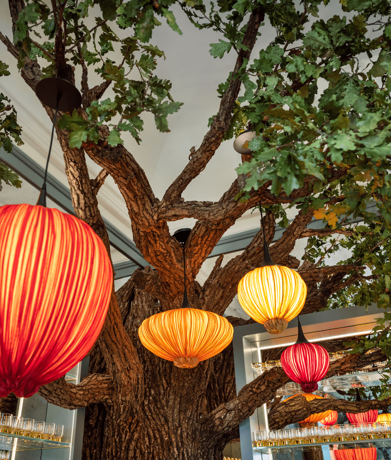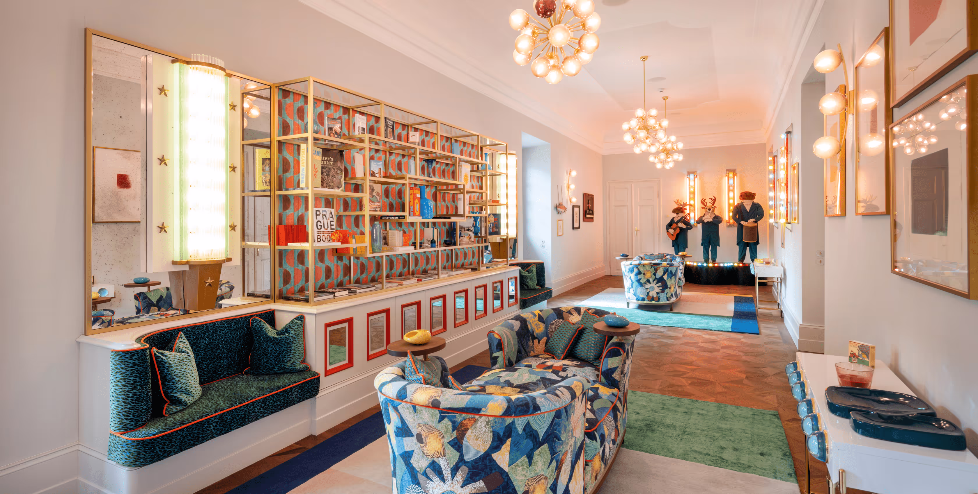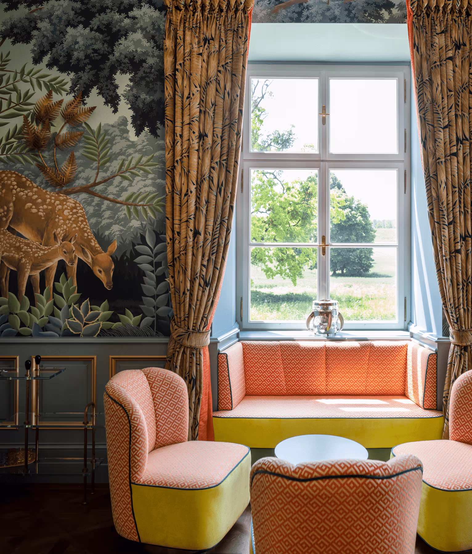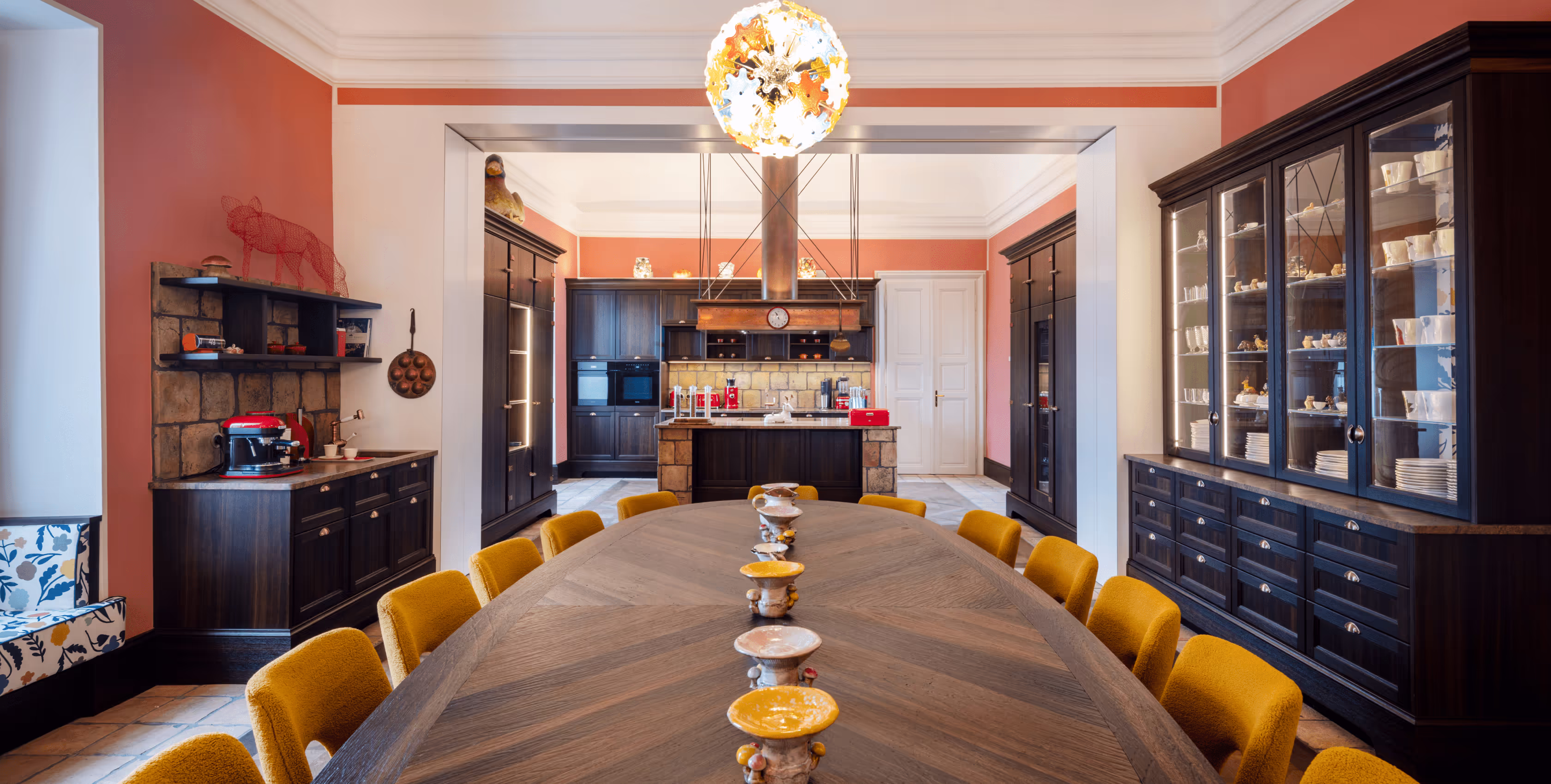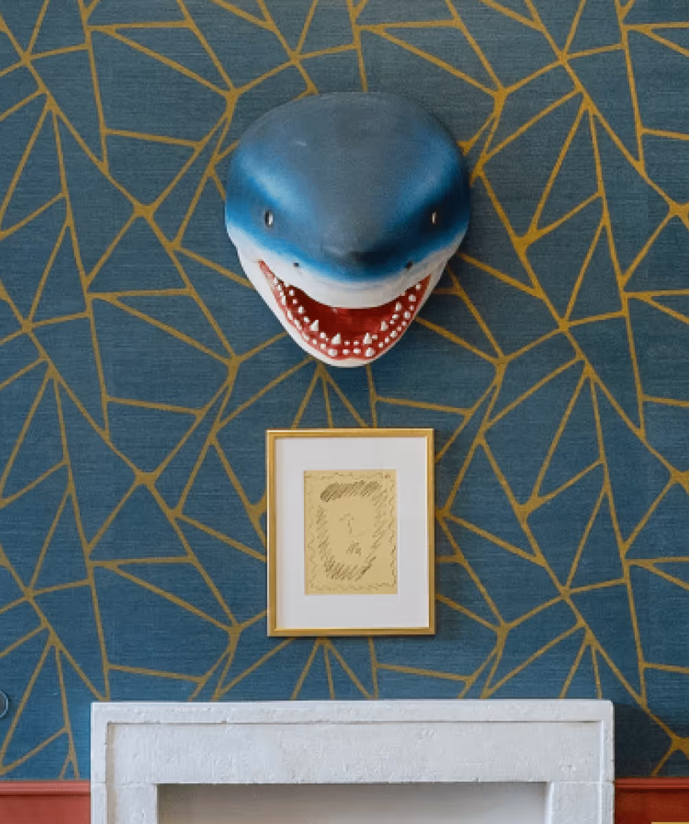 Anstatt des traditionellen Geweihs hängt über diesem Kamin nicht nur eine Zeichnung aus der Sammlung der Hausherren, sondern auch ein künstlicher Haifischkopf.
