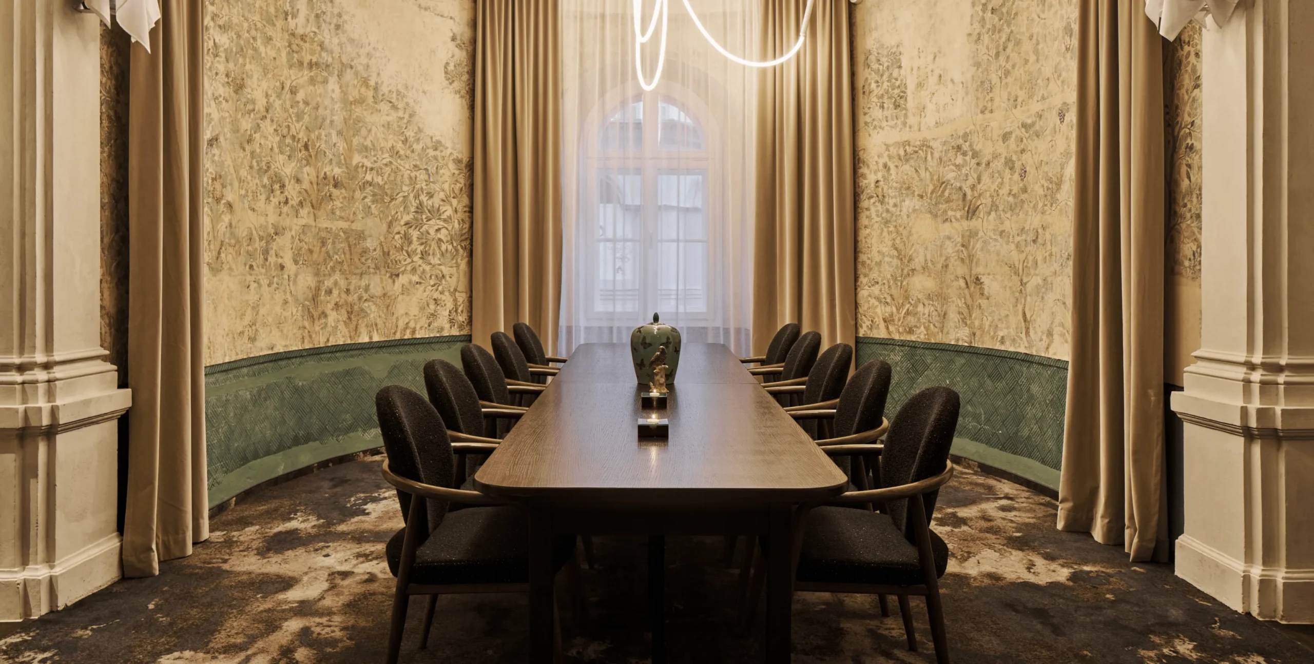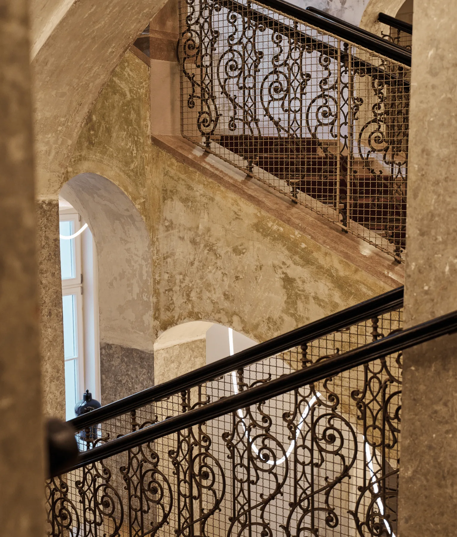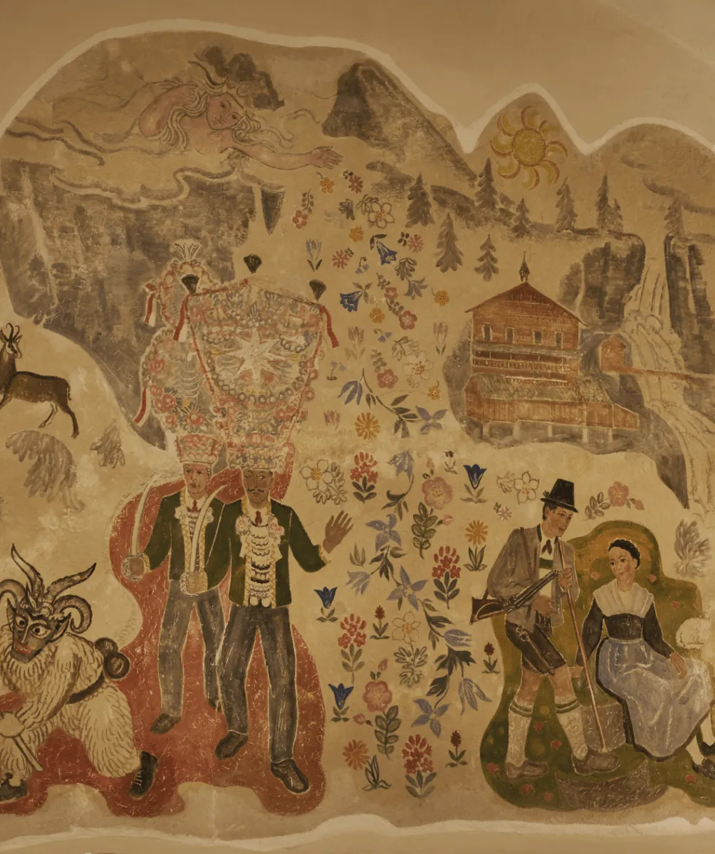 Das kunstvolle Wandgemälde erzählt mit lebhaften Szenen aus der Region eine Geschichte von Tradition und Kultur. Handwerklich meisterhaft erhalten, bleibt es als Ausdruck historischer Identität ein zentrales Element des Raums.
