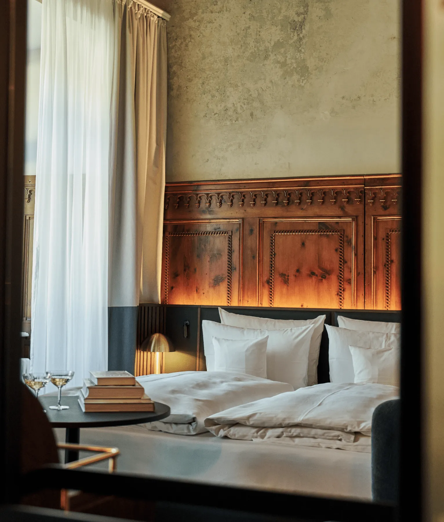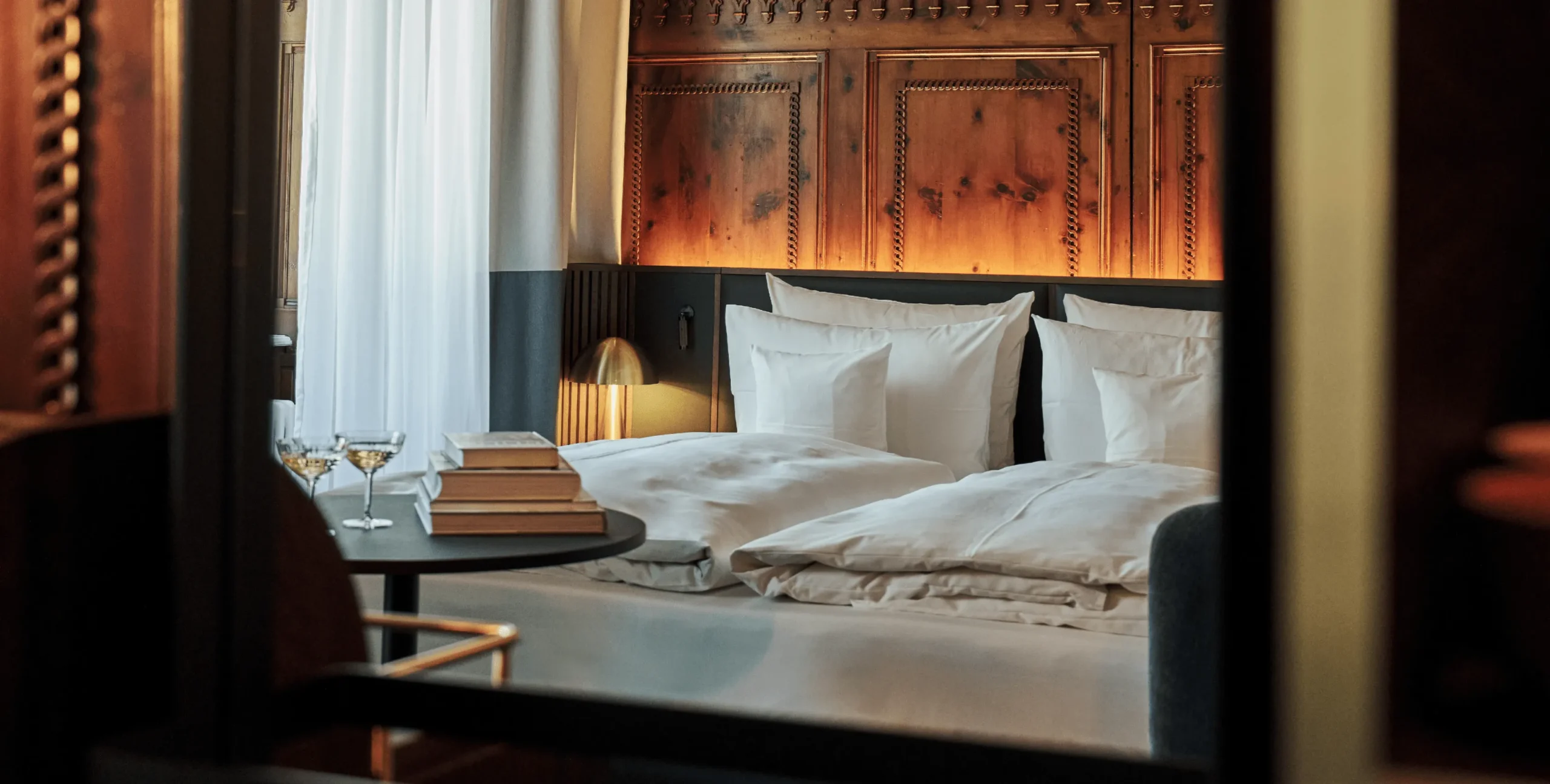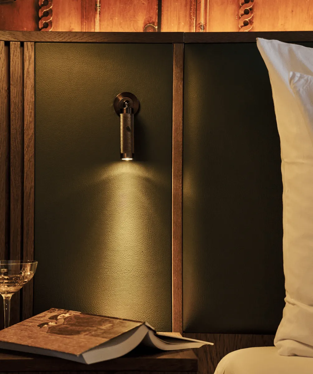 Warmes Licht, dunkles Holz und edles Leder schaffen eine behagliche Atmosphäre. Die reduzierte, funktionale Leuchte setzt gezielte Akzente und verwandelt das Bett in einen gemütlichen Rückzugsort.